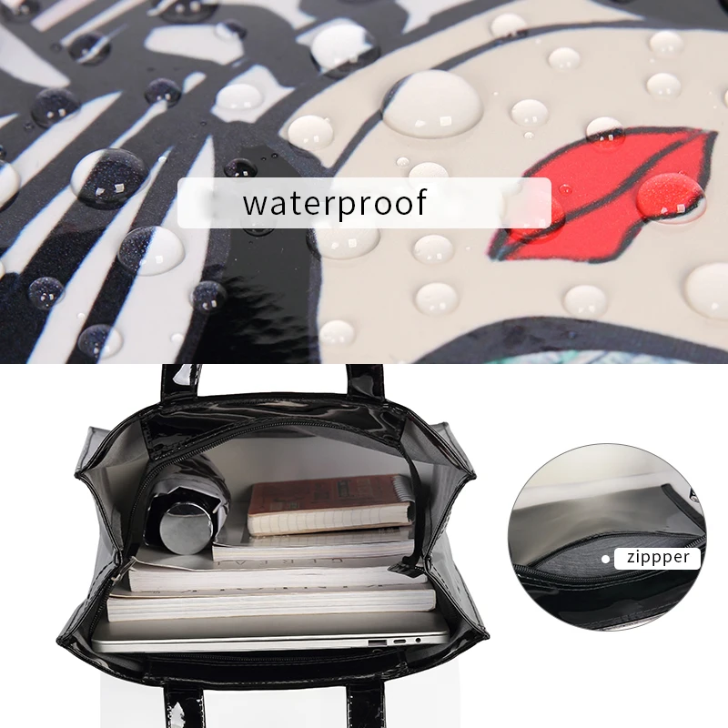 This tote bag is made of high quality PVC with simple designer .it is durable and waterproof.1.Zipper closure:2.Generous enough to accommodate the magazine, books, glasses, wallet, keys, earphone, power bank, cell phone, document and clothes3.You can use it as a " book bag" or shopping bag or work bag or a gift to friend.